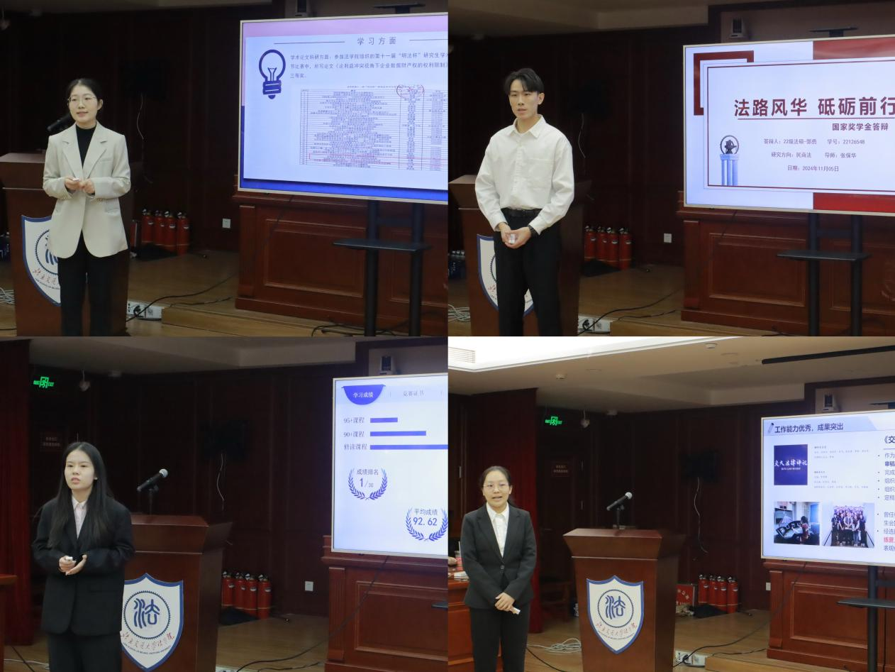 修法明德,知行合一。秉承公平、公正、公开的原则,520夫妻 于10月11日及11月5日在思源西楼模拟法庭举办2023-2024学年国家奖学金评定公开答辩会,旨在贯彻落实国家人才培养政策,培养厚德上进、堪当大任的新时代优秀青年学生,同时以榜样力量带动全体学生勤奋学习,积极进取,推动优良学风建设。学院党委书记张立学,副书记、副院长秦莹,副院长朱本欣,团委书记李兴友,教学科赵栩冉,各系所教师代表,各年级辅导员与学生代表担任答辩评委。