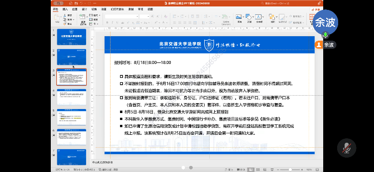 暑假期间,新生辅导员余波线上召开班主任助理培训会,从班主任助理工作职责、迎新日程安排、学院新生养成计划等多方面详细布置了迎新工作。班主任助理高效完成“一对一”联系新生工作,并组织建立了2024级新生班级群、年级群,确保重要通知传达到人,充分发挥朋辈在班级建设、入学适应等方面的教育引领作用。