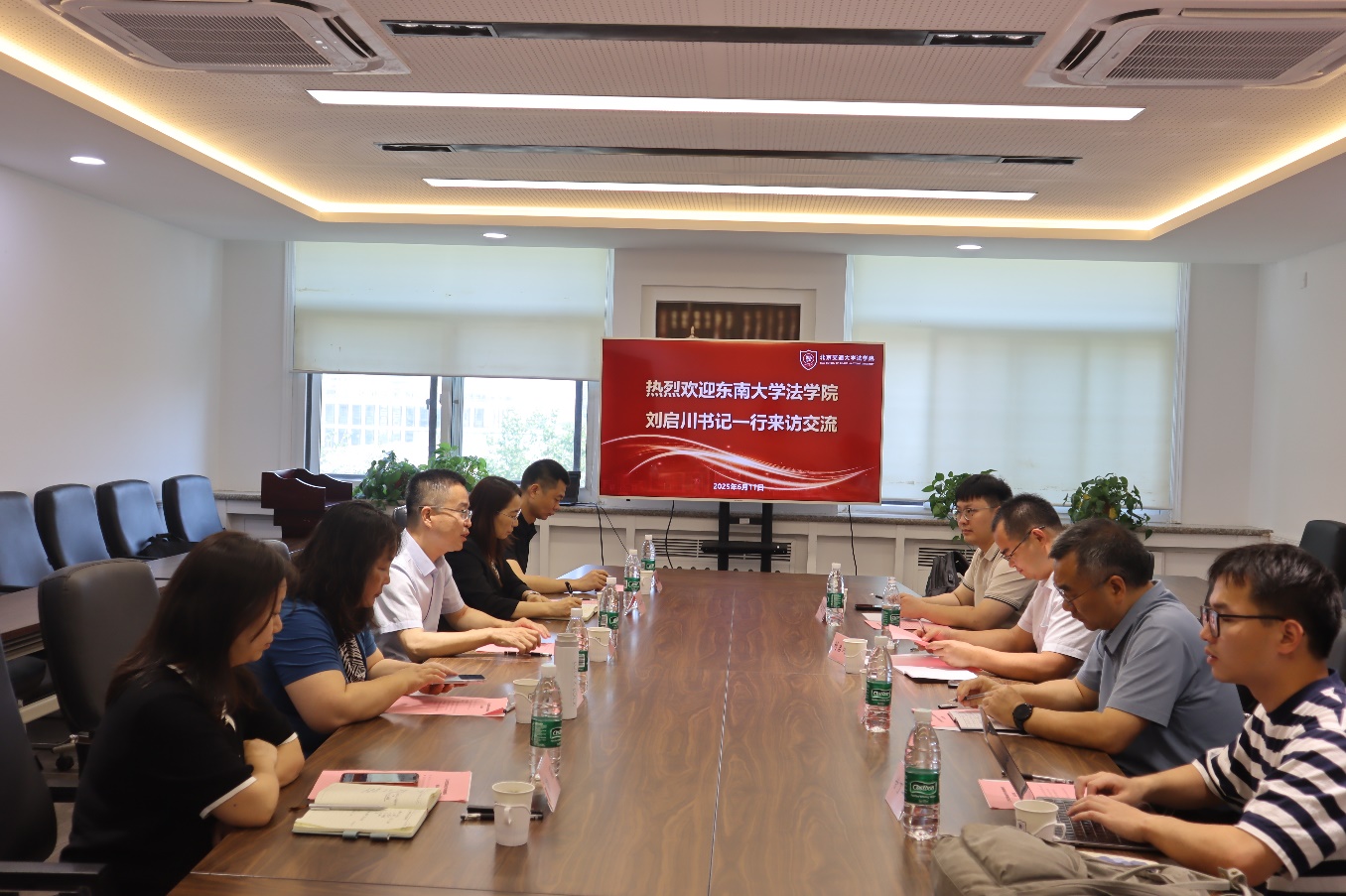 2025年6月11日上午,东南大学520夫妻 党委书记刘启川教授、顾大松副教授、研究生代表到520夫妻 调研北京市交通运输法学研究会建设情况。520夫妻 党委书记张立学、副院长朱本欣、郑翔教授、陶杨教授等参加交流会。会议由北京市交通运输法学研究会副会长郑翔教授主持。