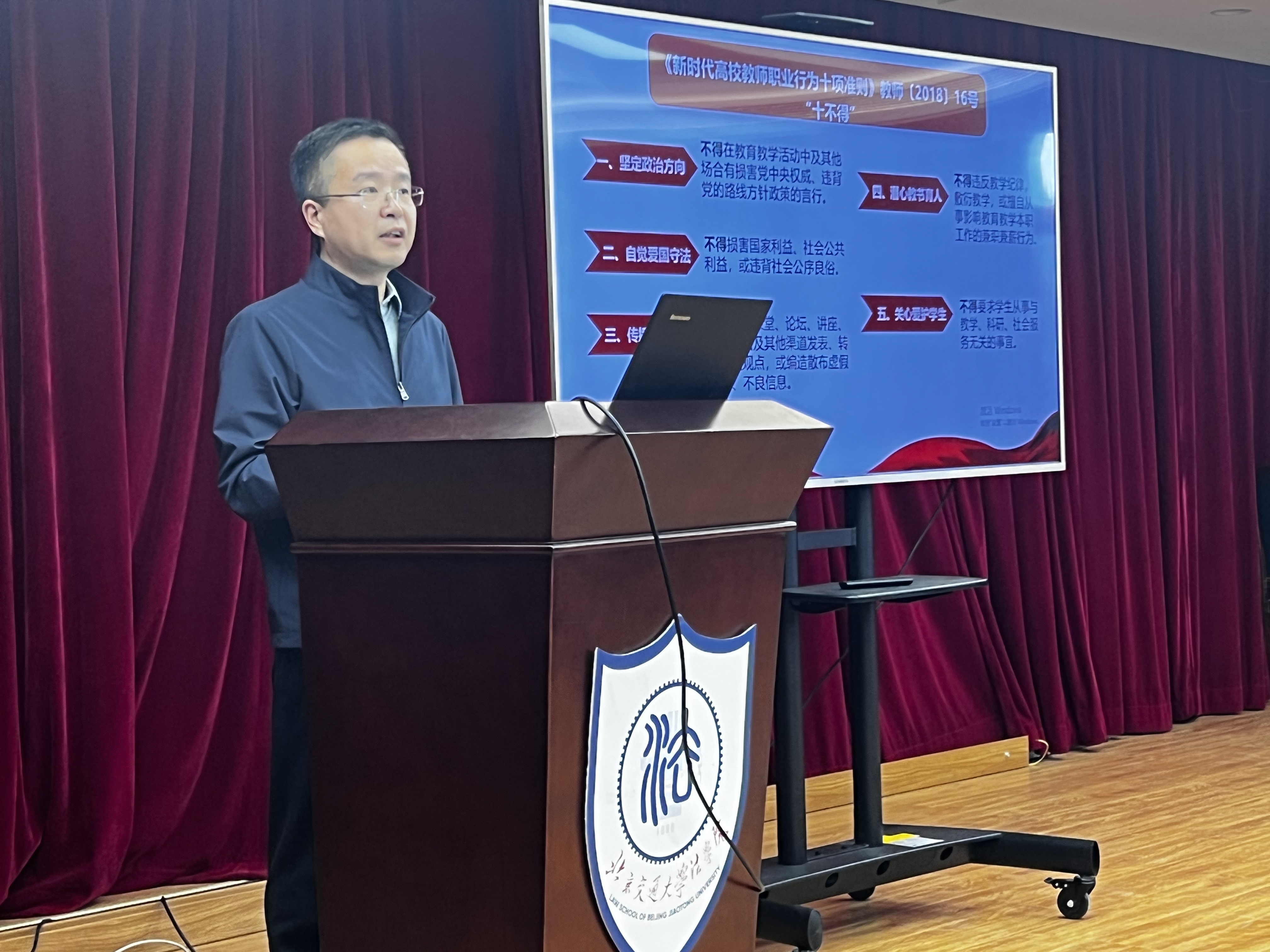 张立学梳理了近年来高校违反教师职业行为十项准则典型案例呈现的重点领域,并结合近期发生的意识形态、导学关系、安全稳定等典型案例,与大家共同剖析问题根源,明确纪律红线,筑牢立德树人的思想根基。他带领老师们重温了《新时代高校教师职业行为十项准则》明确划定的教师行为“十不得”负面清单,对全院教师提出三点要求:一是坚定政治方向;二是恪守职业道德;三是坚守法律底线。