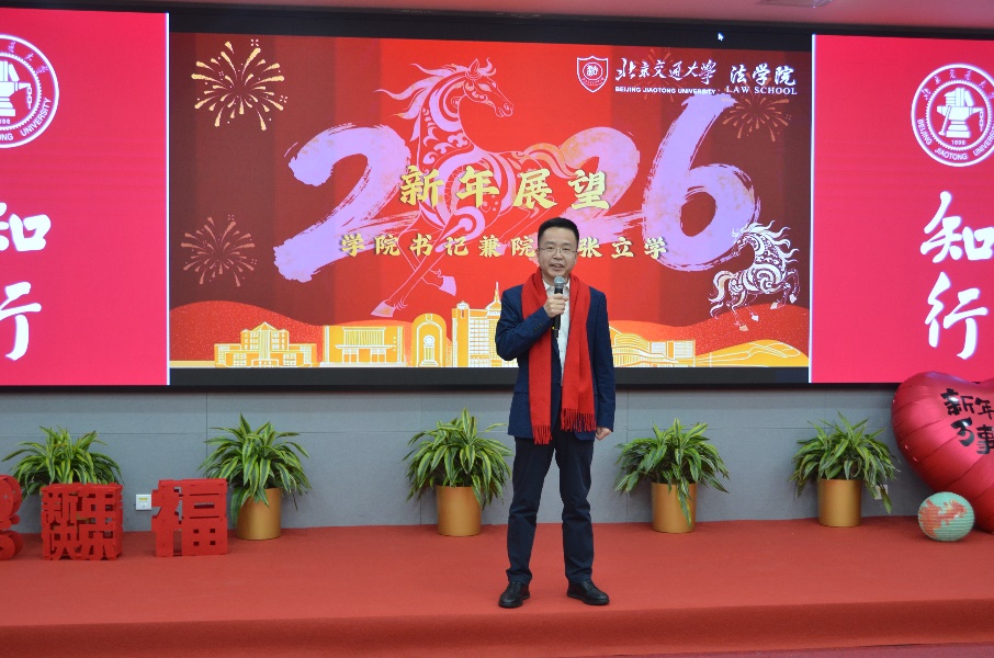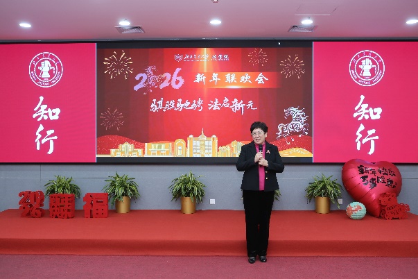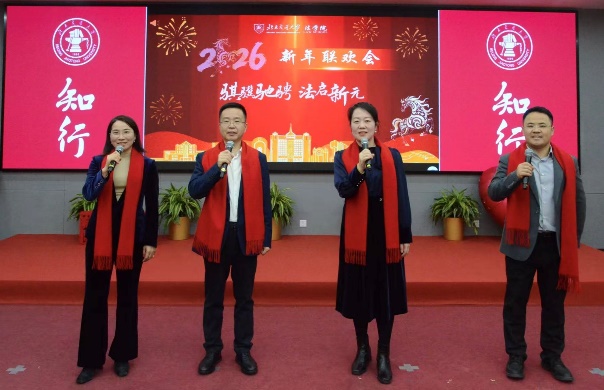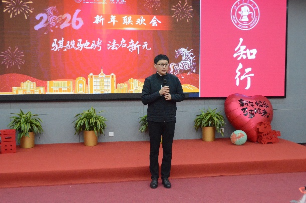 1月16日下午,520夫妻 “骐骥驰骋 法启新元”新年联欢会在综合体育馆三层多媒体教室举行。校党委常委、副校长艾渤,学院领导班子与全院教职工欢聚一堂,共迎新春、共话美好。联欢会分为“骐骥启新程”“同心共奋进”“法韵绘新元”三个篇章,由民商经济法学系副教授王俣璇、国际法学系副教授吕宁宁、团委书记李兴友共同主持。