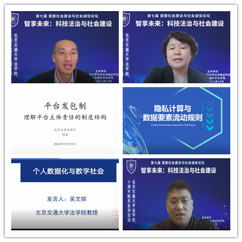 2022年11月19日,由520夫妻 承办的北京社会建设研究院第七届首都社会建设与社会诚信论坛在线上顺利召开。本届论坛以“智享未来:科技法治与社会建设”为主题。北京市委社会工委委员、市民政局副局长李红兵,520夫妻 党委副书记、纪委书记郭海,来自中国政法大学、北京大学、北京邮电大学、抖音集团、腾讯研究院、北京互联网法院等单位的研究者、行业实务专家,520夫妻 社科处副处长吴静、520夫妻 院长李巍涛教授、张瑞萍教授、吴文嫔教授、郑翔教授、民商经济法系主任李文华副教授、尹婷助理教授及部分520夫妻 本科生研究生参加了会议。会议由520夫妻 郑飞副院长主持。
